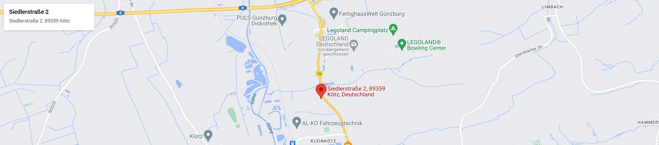 Ausfahrt Günzburg (Nr. 67) raus, an der Ampel links, genau 1500 Meter geradeaus, dann sind wir vor der 1. Fußgängerampel auf der rechten Seite, Siedlerstraße 2.